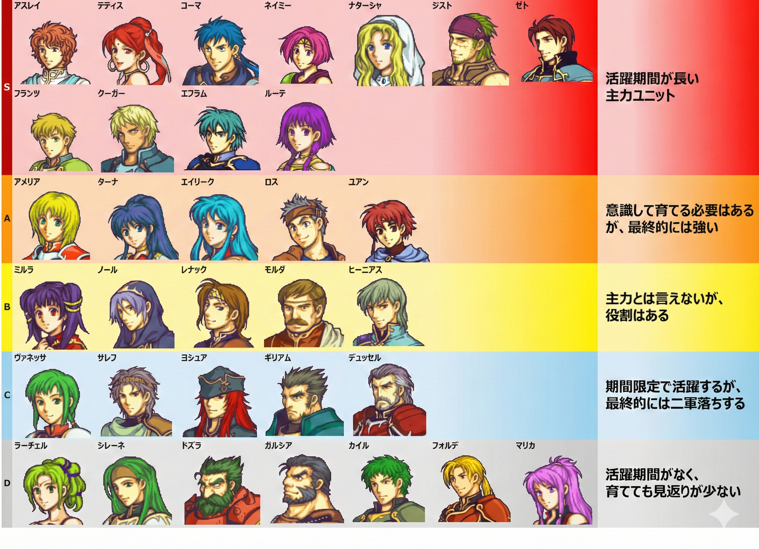 聖魔の光石は全体的にキャラが強い、ドーピングアイテムが入手しやすい、成長率の極端に悪いユニットがいないため、ドーピング前提なら誰でもA評価相当。
